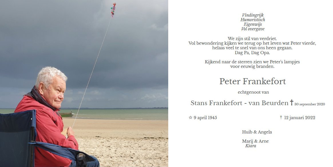 Helaas moeten we mededelen dat Peter Frankefort, onze vader, uitvinder, techneut in hart en ziel, op 12 januari 2022 is overleden.